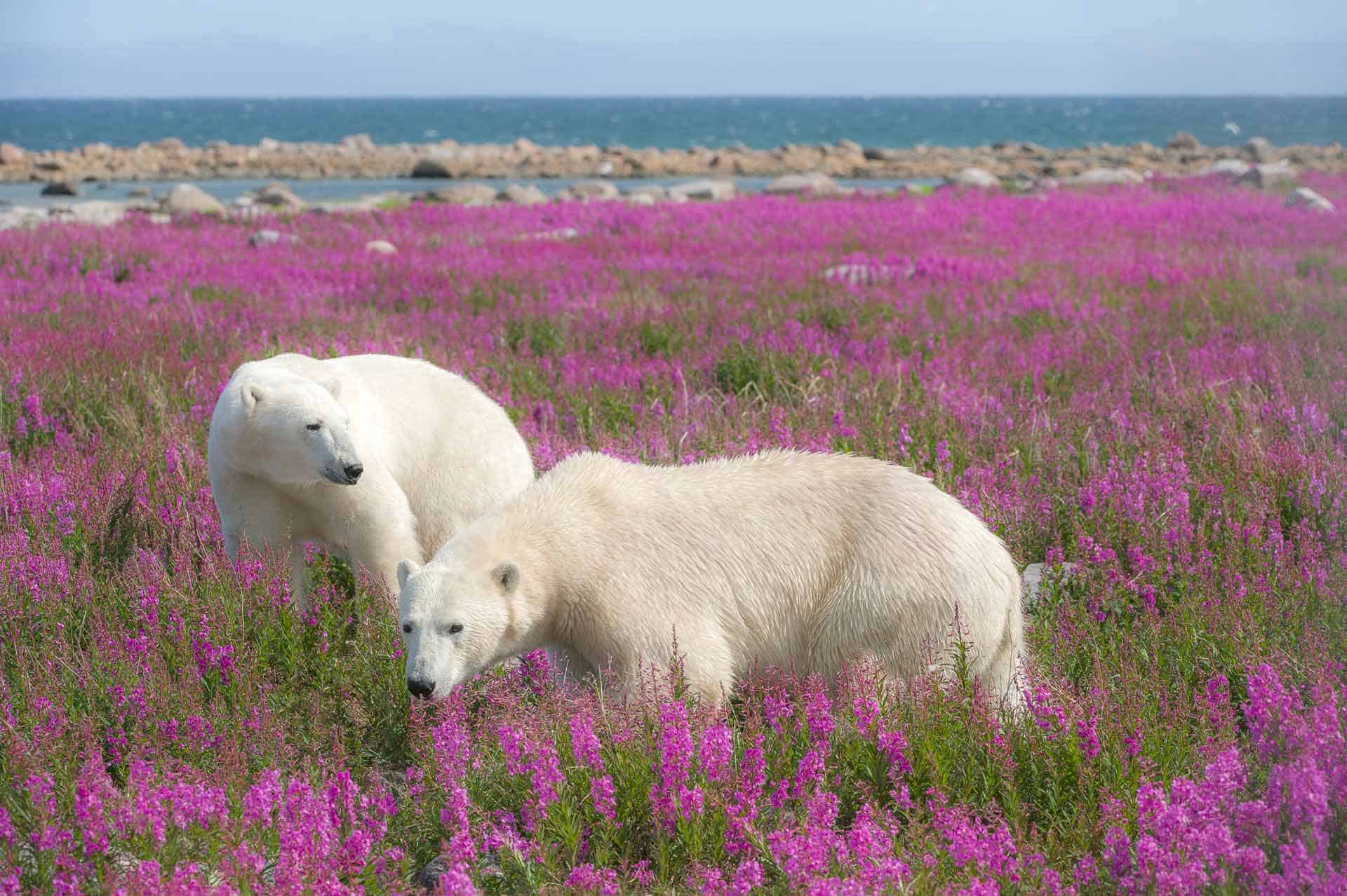 A polar bear stands amongst the wildflowers in Churchill, Manitoba. Image courtesy of Dennis Fast and Travel Manitoba.