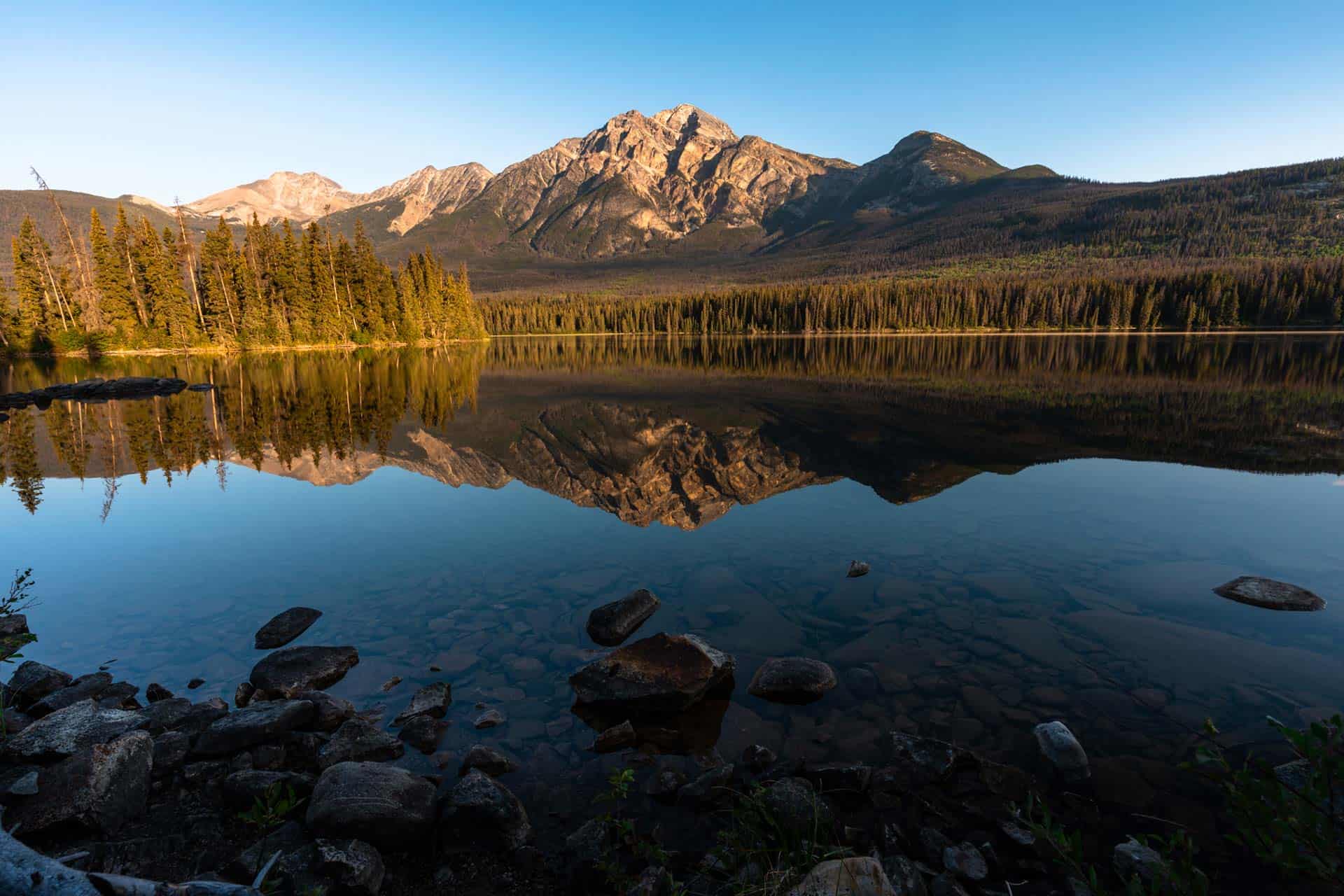 With the iconic Pyramid Mountain soaring above it, this picturesque lake is one of the best places to watch sunrise in Jasper.