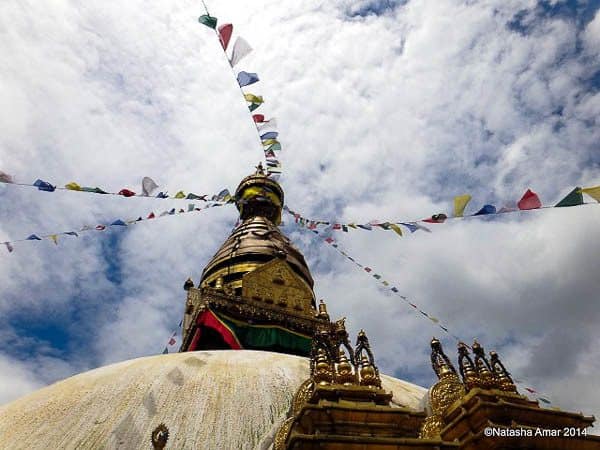 The temple is a picturesque example of the interwoven fabric of Buddhism and Hinduism. The Stupa is a magnificent white structure with a gilded spire on which are painted the bright captivating eyes of the Buddha.