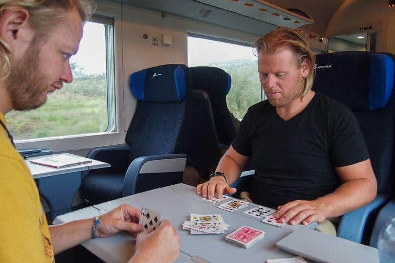 Ginski and Nick playing cards on the train from Bari to Naples.